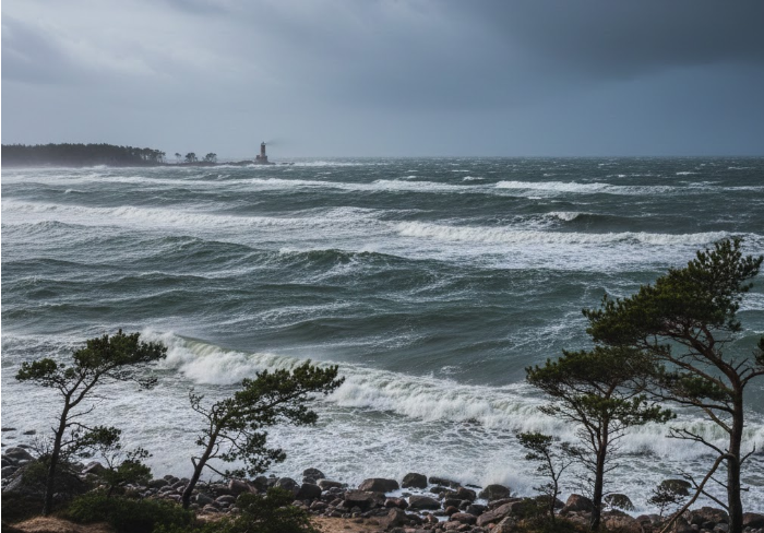 Сильный ветер и осадки формируют атмосферную картину, близкую к настоящему шторму у побережья Балтики, с риском образования скользких участков дорог и усиленного волнения на море.